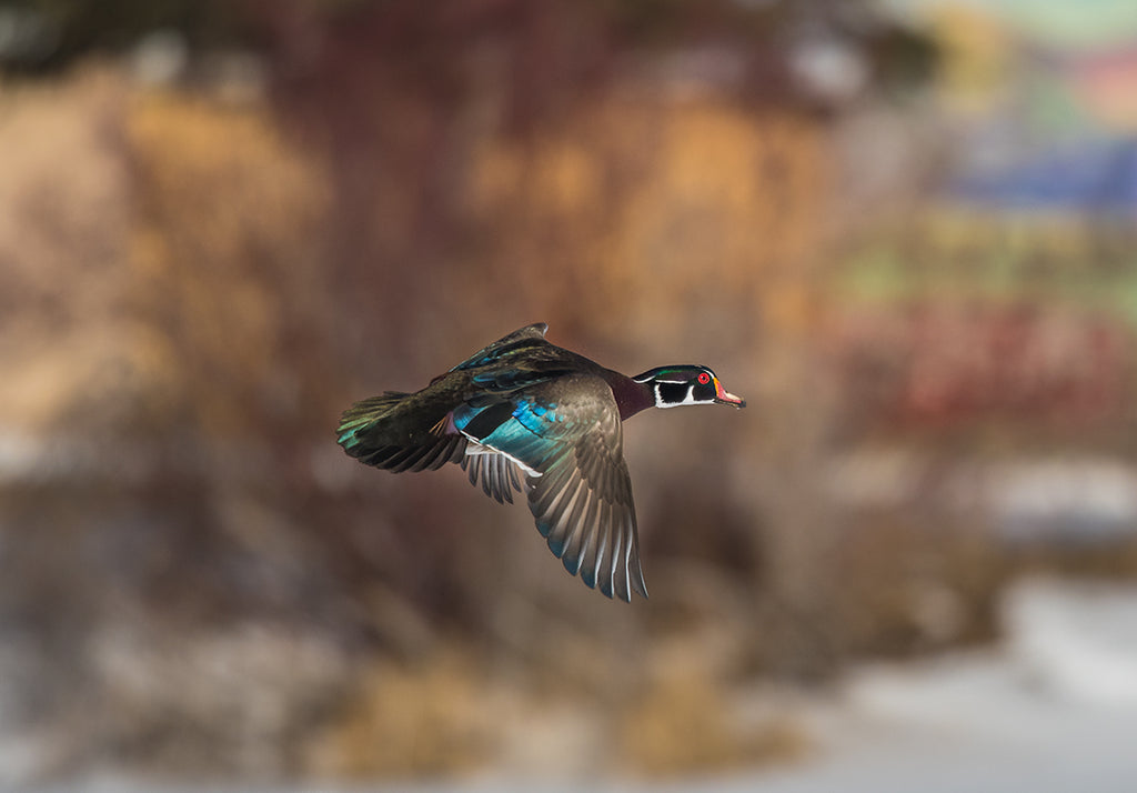 A drake wood duck flies in front of a scene composed of a frozen pond, bare trees, and a colorful mural painted on the side of a building, all lost to a colorful and blurred background while sun strikes his wings. Shipping for framed prints is extra.