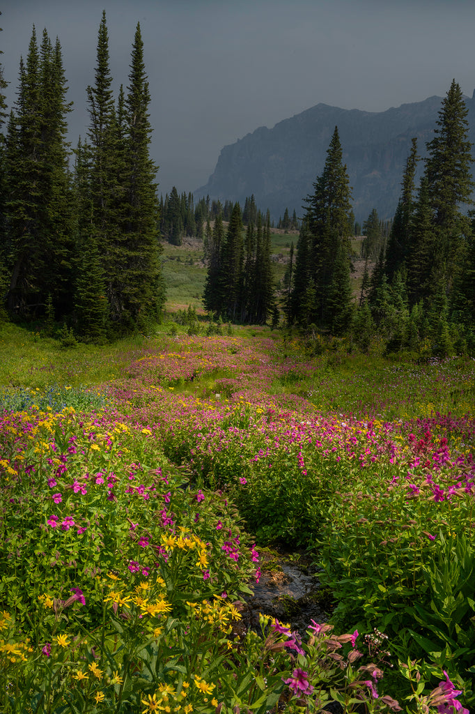 Wildflowers trace the flow of a small stream high in Montana's Gallatin Mountains. At dawn, with the day's first light reflecting of pink and yellow petals, this scene looks like something straight out of Oz - a road leading to paradise.