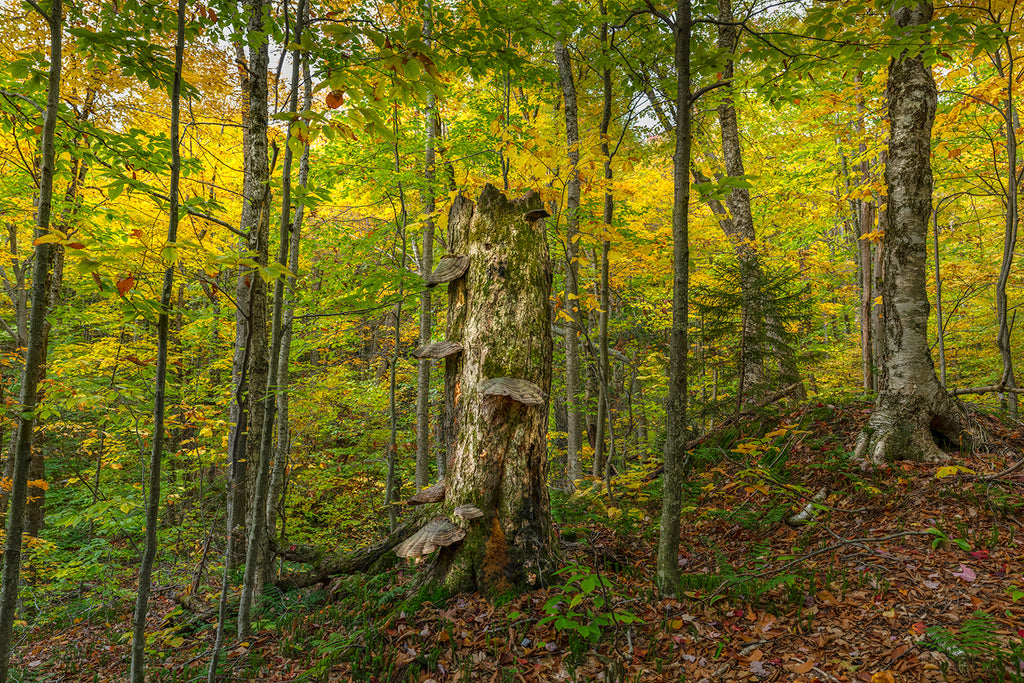 This wide-angle panorama shows a beautiful, deep-woods scene at daylight and features a huge stump covered with large shelf fungi. By stitching together many 24mm shots, I can provide a unique perspective with depth rivaling three dimensions.