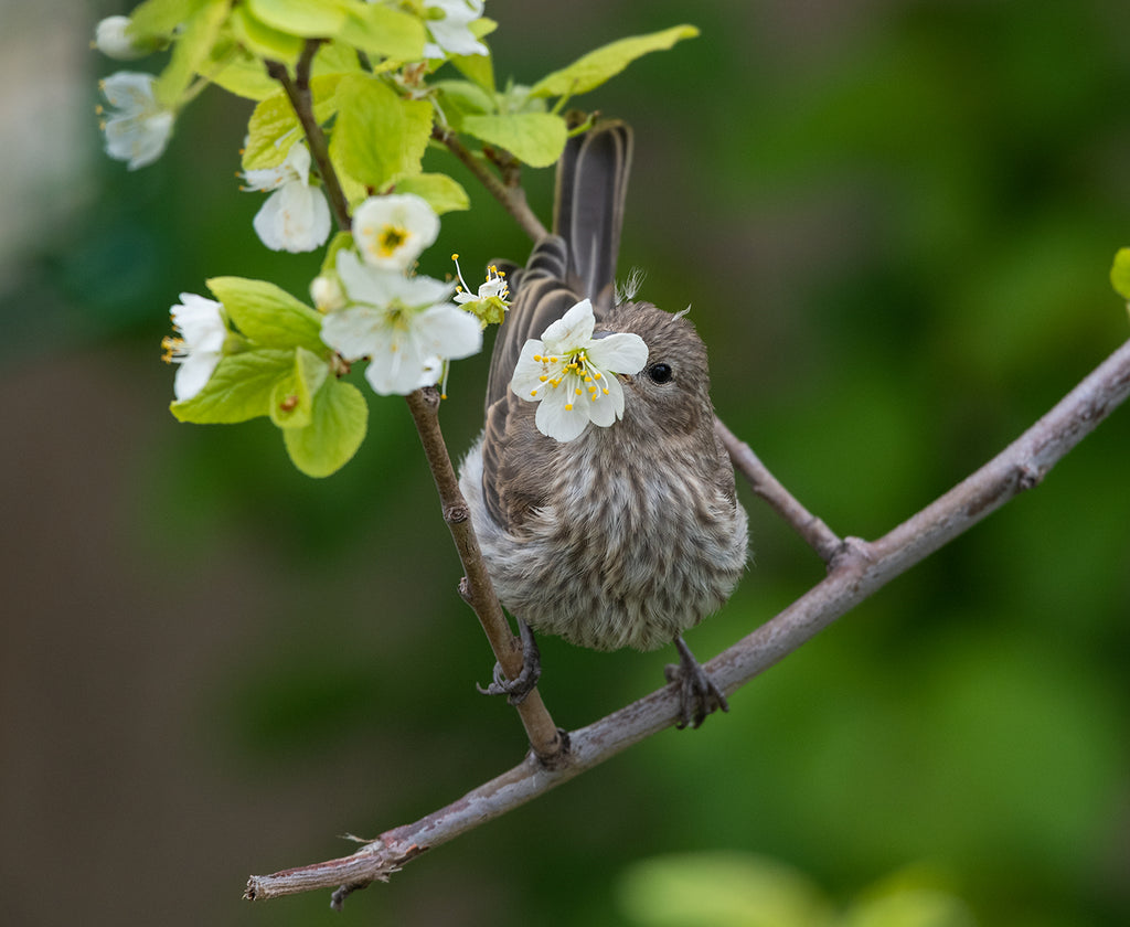 A female house finch plucks a plum blossom from a tree during early spring in Montana. This is a limited edition 16x20 print, limited to a run of 50 images. Each comes signed and numbered by the artist and shipping to anywhere in the lower 48 is included in the purchase price.