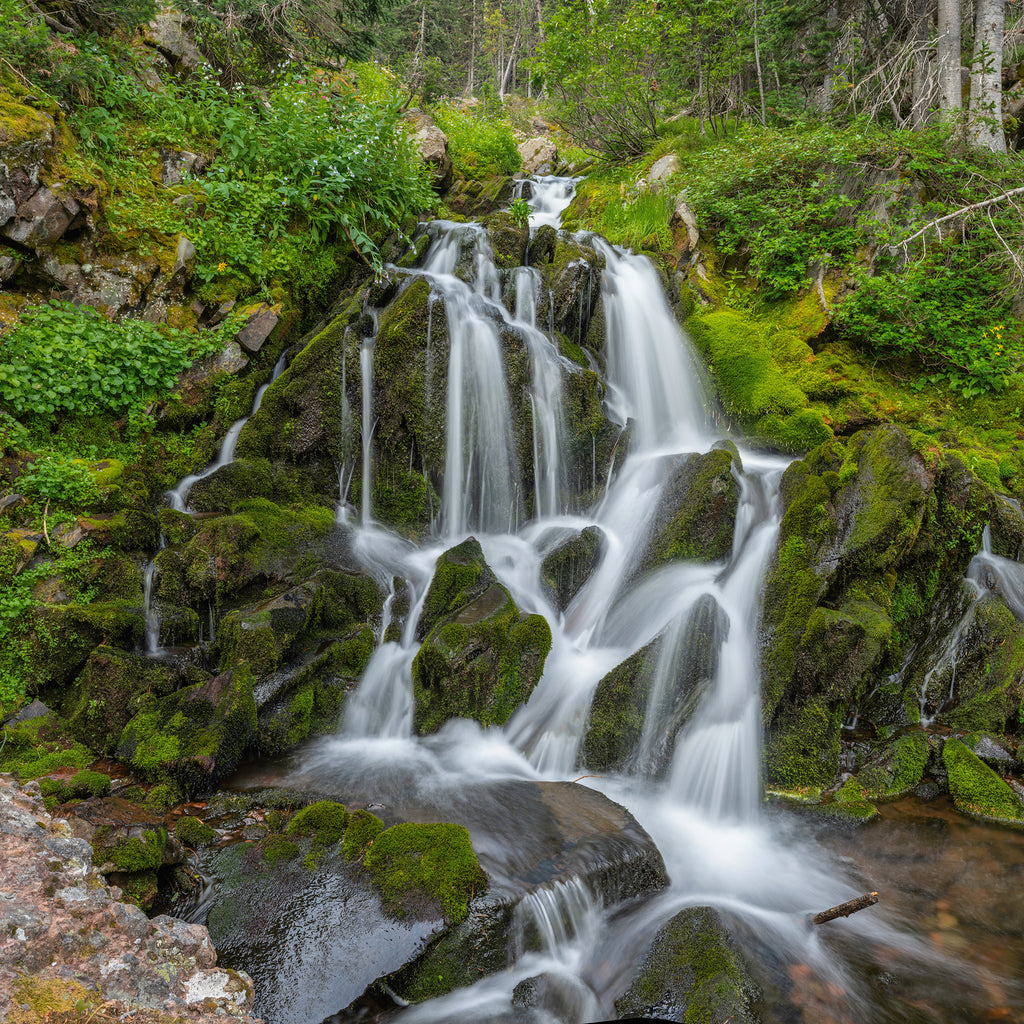 Upper Hyalite Creek, near Bozeman, Montana, drops through one of its many waterfalls on a summer day. Contrasting emerald greens with smooth, flowing water, this is a stunning piece of art offered in 1:1 sizes.